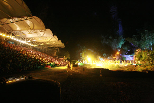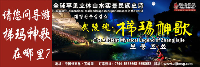 The Ancient Mystical Legend of Zhangjiajie 《武陵魂•梯瑪神歌》是一場記述土家族起源、演變、戰(zhàn)爭、生產生活等內容的大型立體山水實景演出,揉合了音樂、舞蹈、文學等多種藝術形式,如幻如夢的舞美燈光,搖曳生姿的原生態(tài)歌舞……濃縮了土家族數(shù)千年的發(fā)展歷史,400多名演員以自然淳樸的表演充分的展示了土家的民族文化特征,給游客帶來了耳目一新的感受。一場視聽的饕餮盛宴,一曲驚天地、泣鬼神的曠世古歌,給人山水文化光影視聽的享受!境銎罚簭埣医缣莠斏窀栉幕瘋鞑ビ邢薰尽