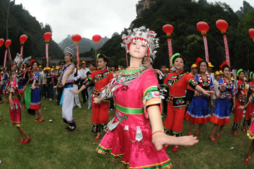 土家族的傳統(tǒng)舞蹈有擺手舞、跳喪鼓、八寶銅鈴舞、跳馬舞、八幅羅裙舞、玩耍耍、秀山花燈等。其中擺手舞影響最廣,是土家族人民喜聞樂見的傳統(tǒng)歌舞形。