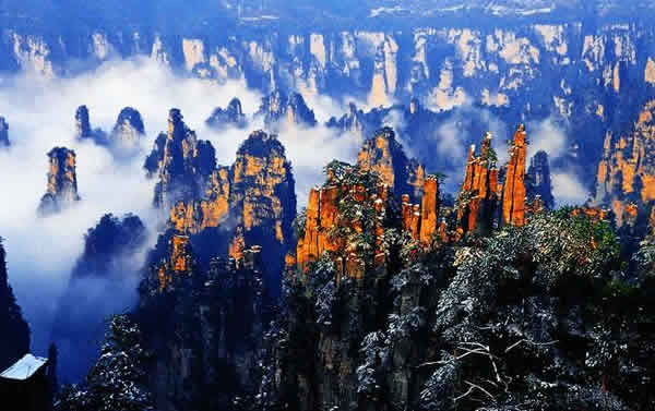 御筆峰 御筆峰被公認為是武陵源砂巖大峰林風光的標志景點,不斷出現(xiàn)在海內(nèi)外各種媒體和宣傳品上面,堪稱天下一絕。本來,這是大自然鬼斧神工的神來之筆,科學上講是歲月風化、浸蝕、切[1]削的結(jié)果,但民間卻把它與向王天子聯(lián)系在一起,說是向王天子殉難后,他的御筆化成石峰,廝守在神堂灣邊;而裝御筆的“簽筒”、“筆架”則留在水繞四門。然而,千古興亡,時代更迭,“古今多少事,都付笑淡中”。只有這支“御筆”還在!在詩人眼中,好用它來寫瀟瀟灑灑的霧,寫多姿多彩的云,寫火一般熱烈的朝霞,寫夢幻般純潔的月光,寫“高處不勝寒”的冰雪世界。當然,也可以寫您熱戀這方山水或者熱戀某位紅顏知己的情詩。