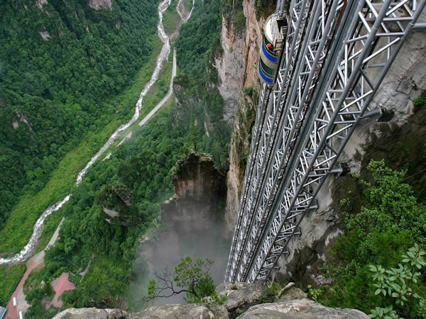 百龍電梯位于世界自然遺產(chǎn)張家界武陵源風景區(qū)。工程分布在4.5公里,垂直高差385米的核心景區(qū)。電梯運行高度326米,主體由154米山體豎井和172米貼山鋼結(jié)構(gòu)井架等組成,采用三臺雙層全暴露觀光電梯并列分體運行。是連通森林公園、金鞭溪、水繞四門到袁家界、烏龍寨、天子山的重要觀光交通設施。百龍?zhí)焯莨こ毯陚、工藝復雜,施工驚險,堪稱“世界工程奇觀”。它的建成創(chuàng)造了三項基尼斯世界紀錄。