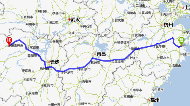 左右,沿途經過三門縣——金華市——衢州市——上饒市——鷹潭市——新余市——宜春市——萍鄉(xiāng)市——株洲市——湘潭市——寧鄉(xiāng)縣——益陽市——常德市——慈利縣——張家界。