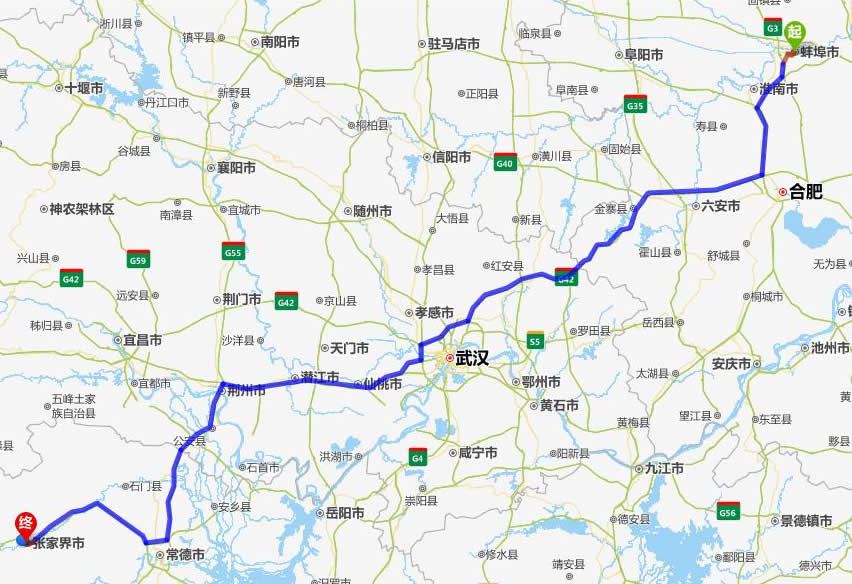 左右,沿途經過蚌埠——淮南市——六安——金寨縣——麻城市——漢川市——仙桃市——潛江市——荊州市——公安縣——澧縣——常德(也可以走國道經澧縣、石門縣)——慈利——張家界。